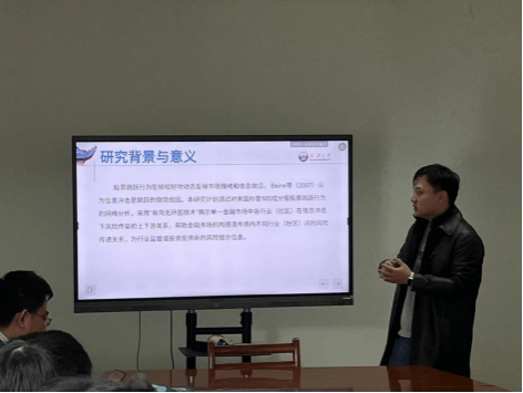 何斯玄(2022级数量经济学博士研究生)汇报了最新的研究成果《金融市场内部风险结构的关联研究 ——基于股票跳跃行为的网络分析》。其课题通过对美国标普500成分股股票跳跃行为的网络分析,采用“有向无环图技术”揭示单一金融市场中各行业(社区)在信息冲击下风险传染的上下游关系,帮助金融市场机构理清市场内不同行业(社区)间的风险传递关系,为行业监管或投资提供新的风险提示信息。