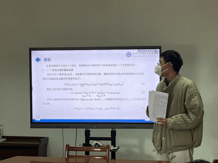 黄仁豪(2022级数量经济学博士研究生)以《双循环视角下的贸易成本、人口迁移与收入不平等研究》为题作汇报。通过构建一个描述多地区间贸易与人口迁移的模型,在双循环视角下分析国内、国际贸易成本、TFP与国内迁移成本的变动及其对收入不平等的影响,并分析发现迁移成本下降能够帮助改善经济增长过程中的收入不平等现象。