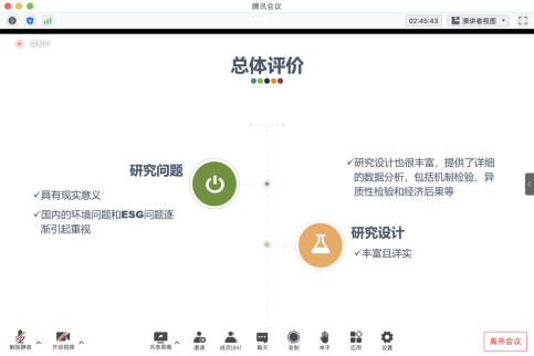 本次活动的第二项内容是研究生论文汇报环节,由林晚发老师和周楷唐老师担任主持人,会议邀请了来自会计学专业的九位优秀在读硕士研究生和博士研究生汇报论文,并根据研究主题邀请会计系博士研究生进行点评。在认真聆听了每位同学汇报后,点评者从研究内容和应用价值等方面做出专业的点评,并对每位同学的研究提出了建设性的修改建议。同学们在线积极交流,踊跃提问,对报告中的学术问题进行了深度的探讨和交流。