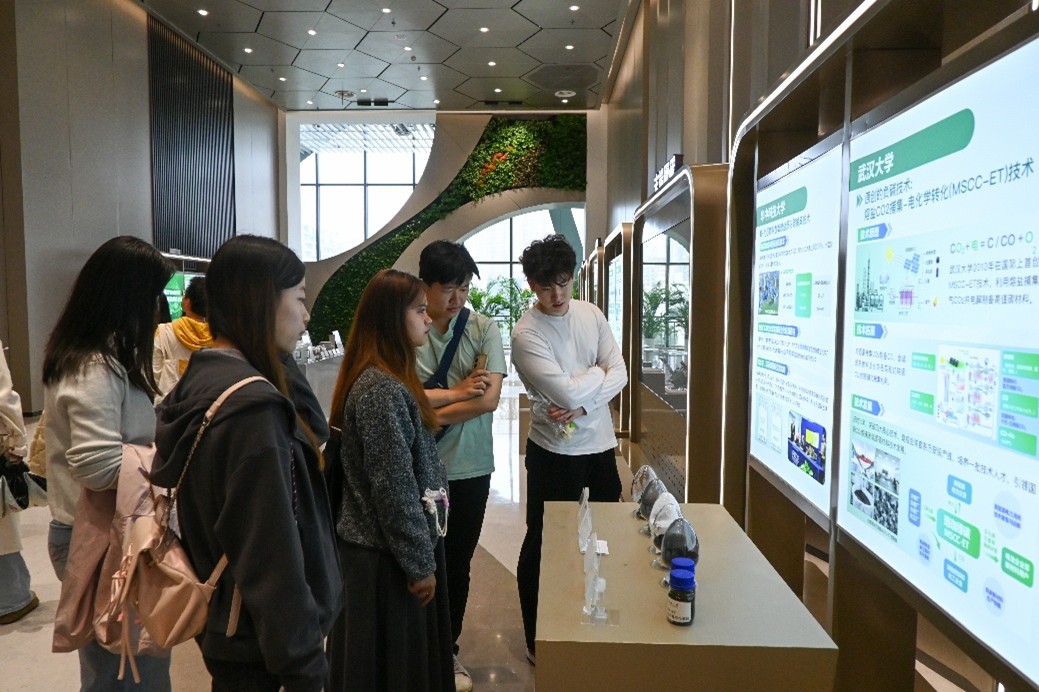 在讲解员的带领下,同学们依次参观了展厅的六个板块,内容涵盖全球气候行动、中国碳市场的建立与成效,以及中碳登在全国碳市场中的关键角色。讲解以全球气候治理脉络为引,从《联合国气候变化框架公约》《巴黎协定》到COP28《阿联酋共识》,勾勒出国际规则框架;随即转入中国路径:提出“3060”目标、构建“1+N”政策体系并推进全国统一碳市场。作为运行中枢,中碳登承担配额分配、注册登记、交易结算、履约管理等职能,汇聚并规范全国碳排放数据。现场同步展示市场运行与履约成效及湖北实践,制度成熟与市场活力一目了然。