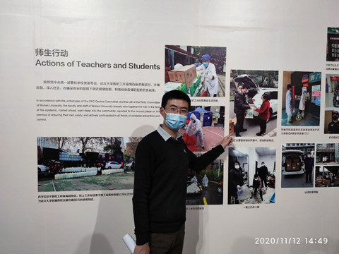 在本次展览“守护珈园、师生行动”图片展部分,我们看到学工办党支部王江海同志曾经抗击新冠疫情的照片。王江海同志在疫情期间,作为学校疫情防控突击队成员,在疫情最严重的时候主动下沉社区,先后五次为留校学生发放防疫物资、多次去宿舍看望留校博士、参与文理学部家属区值守16次等等,用实际行动在疫情防控这场没有硝烟的战场上检验了共产党员的初心和使命,成为战“疫”一线的最美逆行者。