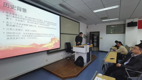 主题党日活动的最后一个环节是党史学习教育。金融系教师党员薛畅主讲了题为《中国共产党领导的根据地和解放区的货币发展史》的学术报告,报告介绍了中国共产党土地革命战争和抗日战争时期领导根据地的货币发行事业,回顾了根据地货币发行的历史背景、货币制度、货币思想和历史经验。从学术角度分析,红色根据地的金融发展史对当前我国货币政策和人民币国际化事业有重要的借鉴意义;从党史学习教育角度来讲,帮助党员们从另一个角度回望那段光辉的峥嵘岁月,从货币的发展体验红色文化、感受革命先辈们的崇高理想。