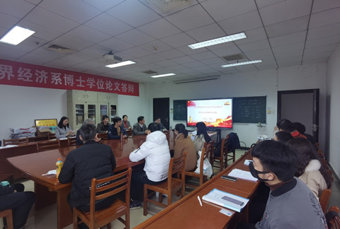 2021年12月16日下午,世界经济系教师党支部组织全系教师和博士研究生共同学习党的十九届六中全会精神,支部书记胡艺讲《中共中央关于党的百年奋斗重大成就和历史经验的决议》专题党课。