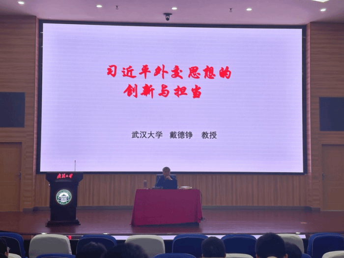 戴德铮围绕“习近平外交思想的确立与底气”、“习近平外交思想的科学性与创新”、“科学指引新时代中国外交(担当)成功”以及“学术建言:永葆‘四心’,砥砺前行”四个主题,详细介绍了习近平外交思想形成背景与核心要义,深刻分析了我国当前面临的外部环境与取得的外交成就,系统阐述了中国特色大国外交的战略布局并结合同学们的专业背景、学习阶段进行了指导与激励。