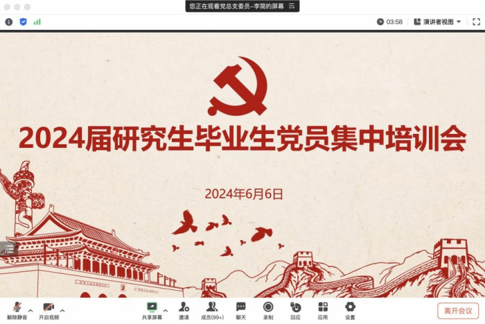 2024届毕业研究生党员纪律教育党课及毕业生党性教育活动线上会议顺利举行。活动重点对毕业生党员进行纪律教育及党性教育。学院各研究生党支部2024届全体毕业研究生党员及研究生党总支委员出席会议,会议由学院研究生党总支委员李简主持。