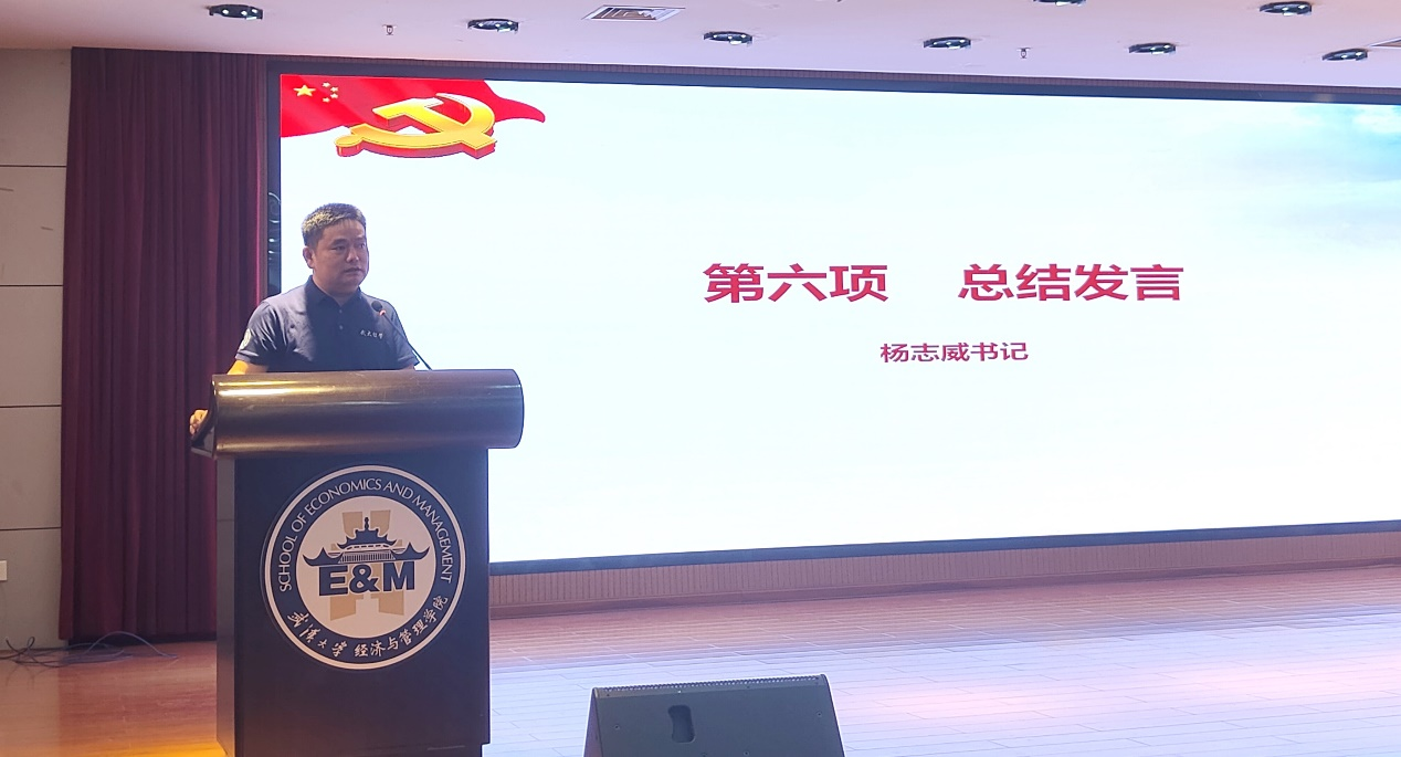 党委副书记杨志威老师作总结讲话。他认为本次党日活动主题明确,形式丰富,载体多样,值得肯定。同时,他希望同学们“学有所思”,鼓励管工学子努力提升专业素养和思想觉悟,展现自我风采,为学院、学校以及国家的发展贡献智慧和力量。