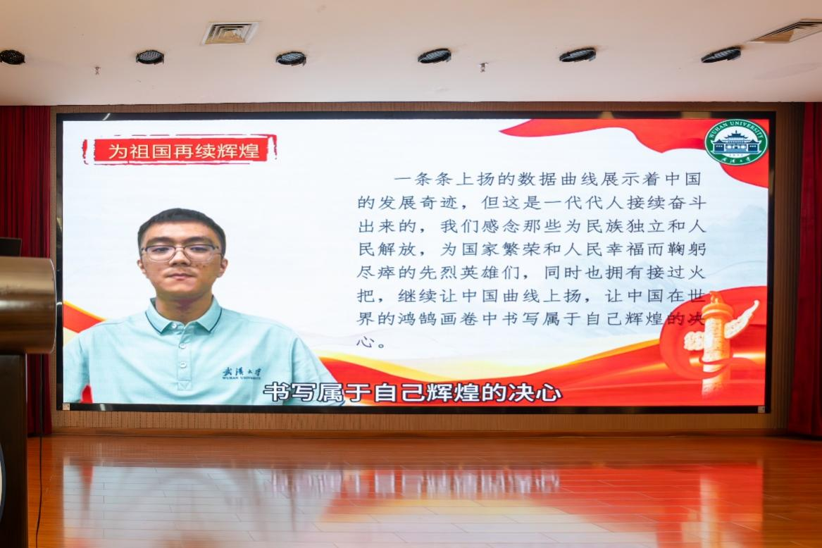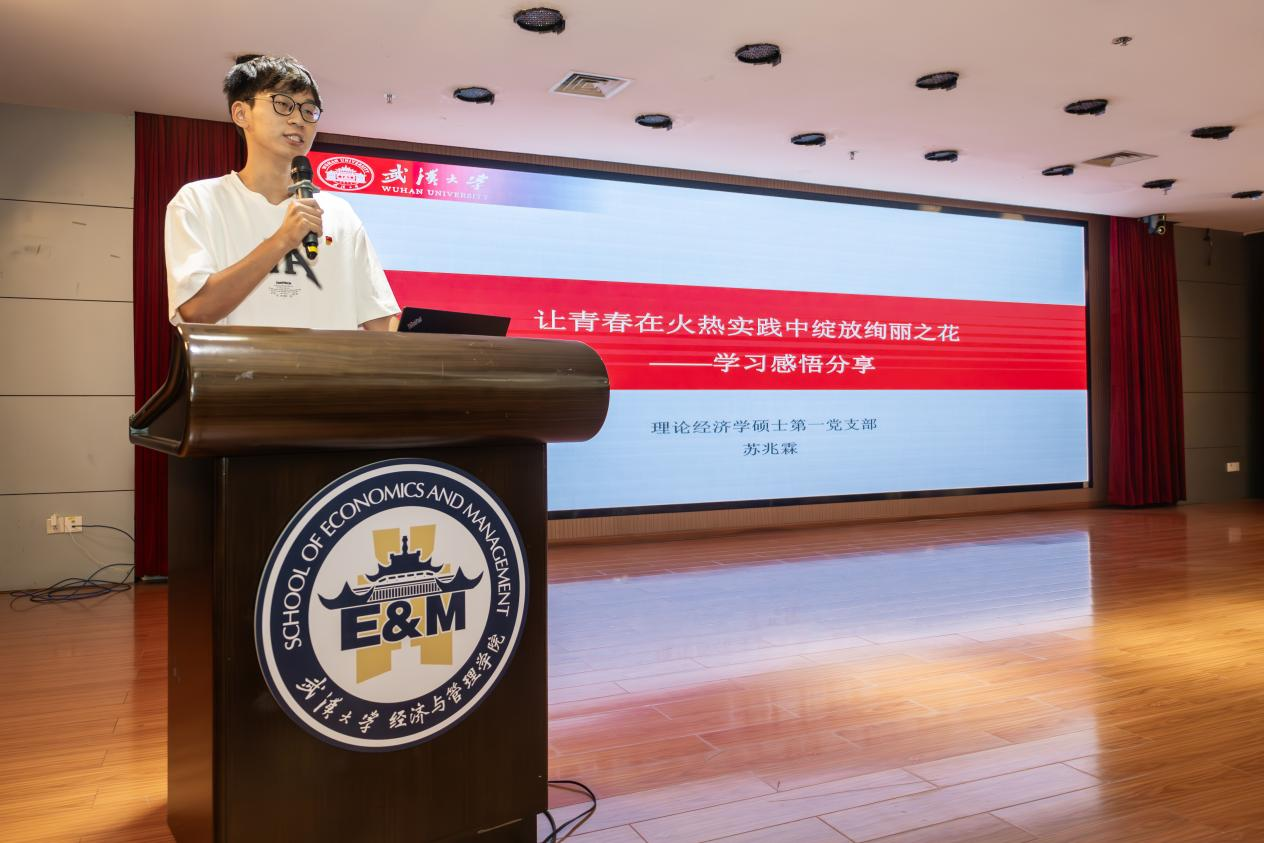 理论硕二党支部刘一苇同学为大家朗诵了文字作品《共鉴荣光,笃行致远——学习贯彻习近平总书记重要回信精神》。在刘一苇同学的深情朗诵中,各位同志深切感受到习近平总书记对武大学子的殷殷期望。
