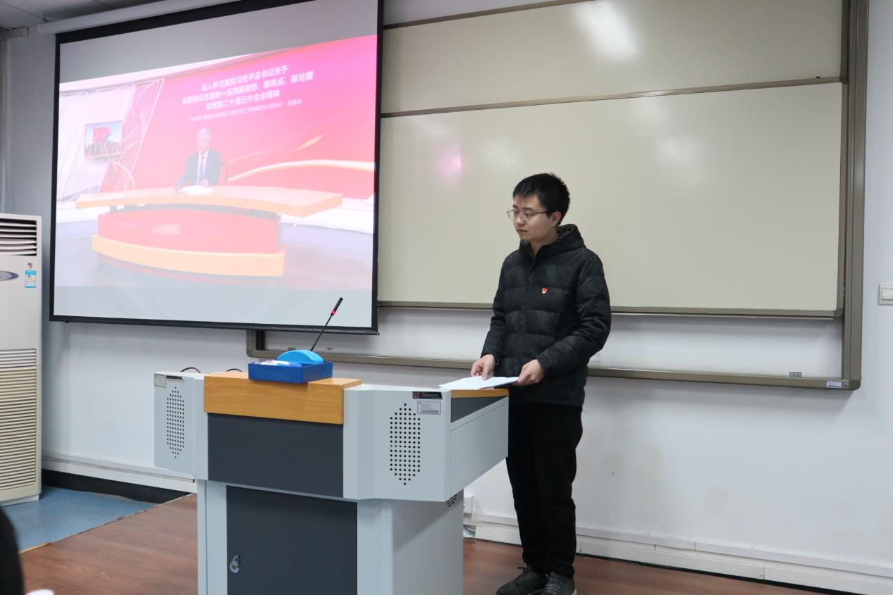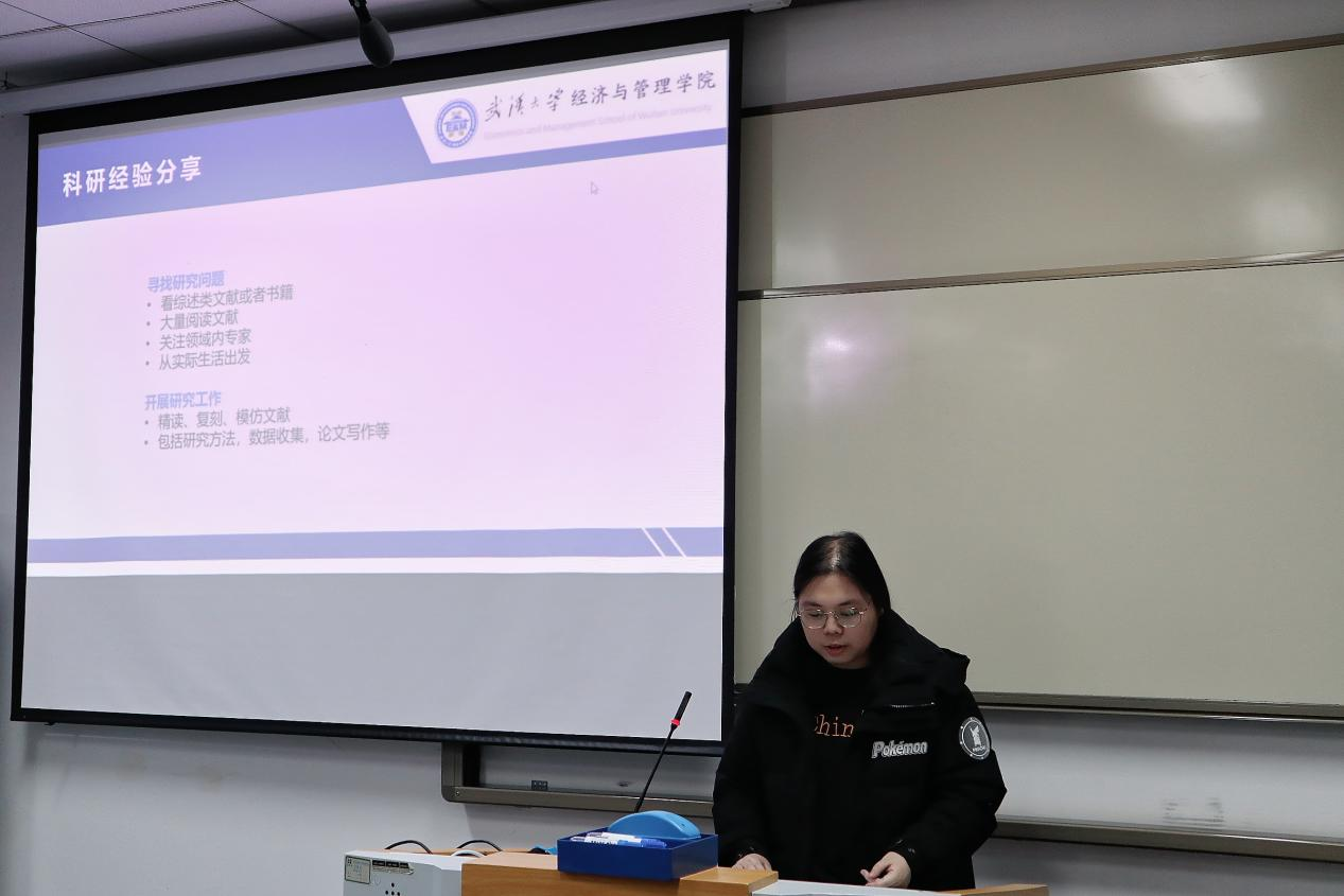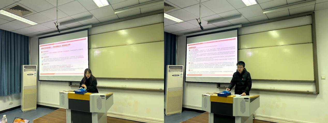 在经验分享后,活动进入年终总结与展望环节。应用经济学硕士第三党支部书记伍梦圆、应用经济学硕士第四党支部书记钟林峰依次对过去一年支部工作进行汇报,明确取得的成绩与改进方向。