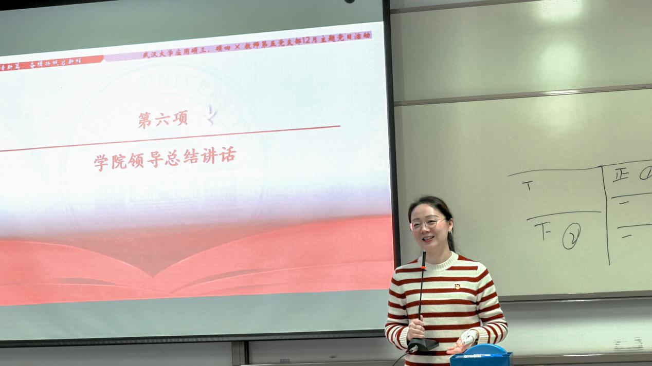 罗知教授为本次党日活动做总结讲话。她鼓励大家将个人成长与学校、社会以及国家发展紧密结合,不断探索未来的发展方向。教师的寄语为此次活动画上了圆满的句号,同时也为全体党员在新征程中继续奋斗注入了信心和力量。