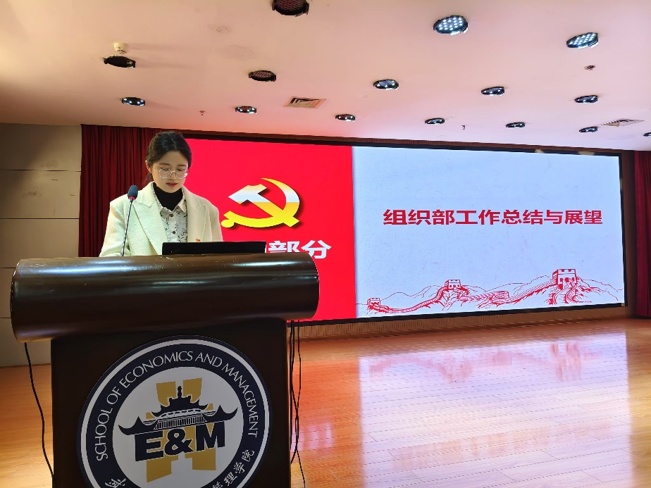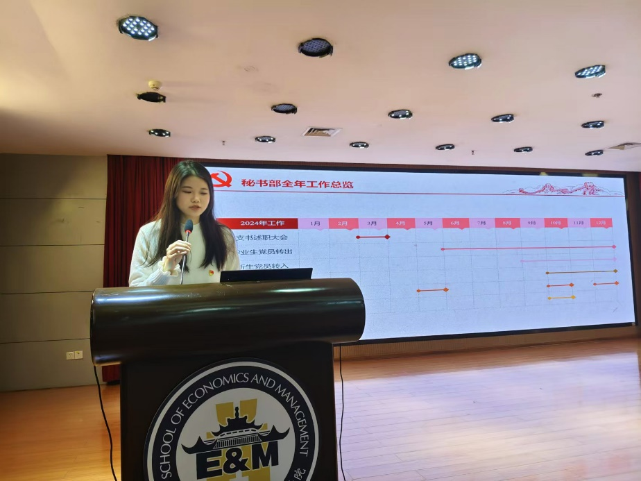 研究生党总支委员韩睿怡针对组织部的工作进行汇报。2024全年新增44人申请入党,54人被列为入党就分子,87人发展成为预备党员,79名预备党员通过考察转正为正式党员。组织部除了日常工作外,还重点强调了两项工作。一是坚持把政治标准作为发展党员的首要标准,二是对支部发展对象推优程序进行了优化。在2025年将进行第一批预备党员转正,并开展毕业生建档和查档工作。