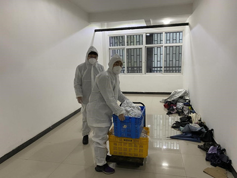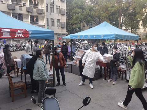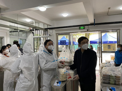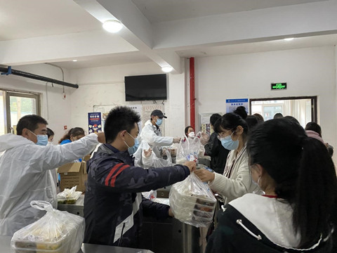 老师负责送往包保楼栋寝室。老师们不断调整工作方法、提高效率,仅20分钟分发完毕近3000份餐,保证同学们能吃到热气腾腾的饭菜。