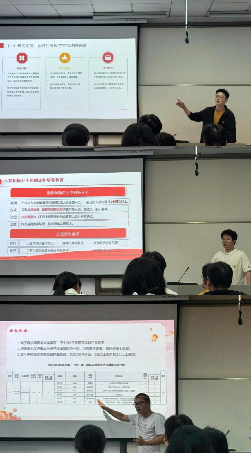 本科生第一党支部的祁宇轩同志则就“如何开展‘三会一课’”进行实务教学,助力学员掌握党内组织生活开展方法。祁宇轩同志还介绍了本科生第一党支部在发挥发展对象评议方案功能、培育支部建设中坚力量方面的做法。