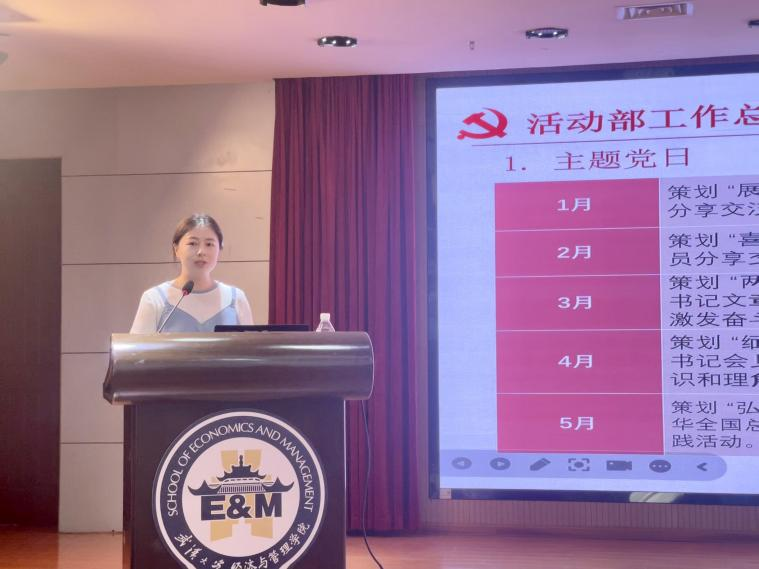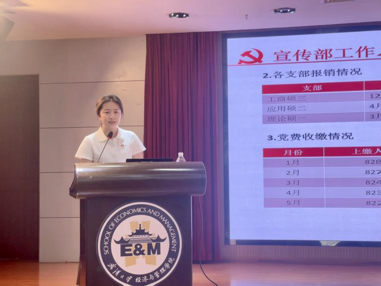研究生党总支委员许继文总结了2025年上半年研究生党建活动开展情况,具体包括策划每月党日活动主题、统计并督促纪检委员填写会议记录簿、开展主题党日评选以及组织开展微党课大赛、组织“活力创新工程”项目的申报与考核等。她重点表扬了在主题党日评选活动中获得“优秀”的支部,表示期待各支部继续完善“三会一课”的记录,并在活动的开展形式上加以创新。