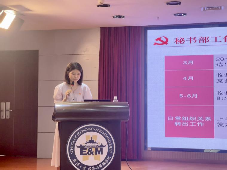 陈文娟总结了2025年上半年学院研究生党员管理与组织关系转接等有关方面的工作,包括星级支部评选、毕业生党员名单收集、动态信息表整理、毕业生党员转出工作等。她就过往档案转入和转出情况做出汇报,并针对接下来6月毕业生党员档案转出过程中可能会出现的问题提出了切实的解决途径。