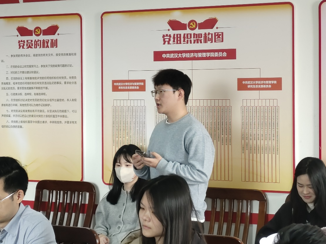 交流互动环节,师生代表结合学习体会与实践经历踊跃发言。教师第七党支部青年教师程生强老师表示,本次党日活动加深了自己对新质生产力内涵与实践路径的理解,深刻领悟法治建设的意义,为日常活动提供了思想引领。工商管理学硕士第一党支部的李昌翔同学结合专业谈到,人工智能作为新质生产力的重要体现,为经管学科研究与实践带来了新机遇,未来将积极探索前沿技术与专业领域的融合。