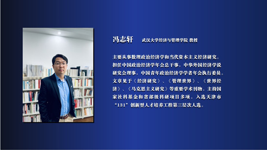 主持人:冯教授主要从事数理政治经济学和当代资本主义经济研究。他担任中国政治经济学年会总干事,中华外国经济学说研究会理事,中国青年政治经济学学者年会执行委员。于《经济研究》《管理世界》《世界经济》《马克思主义研究》等重要学术刊物发表多篇论文。主持国家社科基金和多项省部级科研项目。入选天津市“131”创新型人才培养工程第三层次人选。有请冯教授。