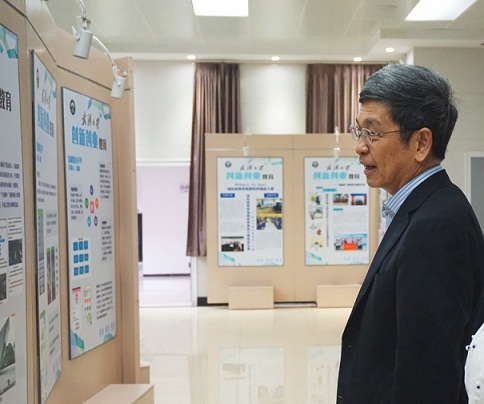 Mr. Tian in WHU Student Entrepreneur & Innovation Exhibition Hall, reviewing his juniors’ achievements