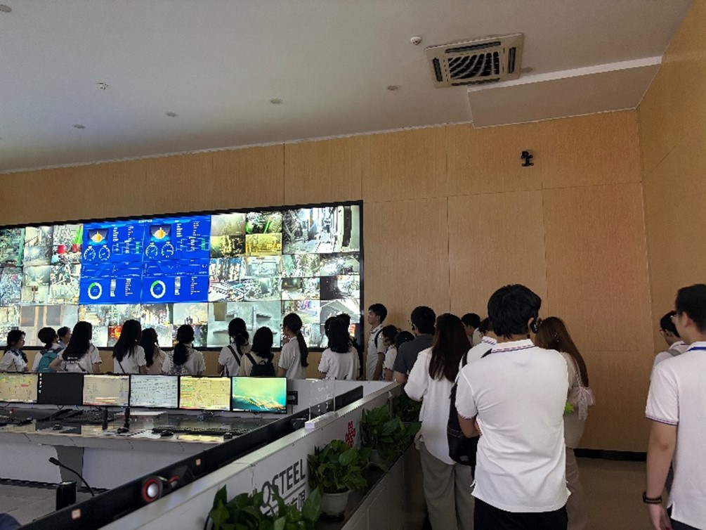 随后,师生们来到炼钢操控中心,现代化的操控设备与智能化的生产流程让师生们惊叹于传统工业在数字化转型中的积极探索与成功实践。通过大屏幕,师生们可以实时观察炼钢炉内的高温熔炼过程,同时,技术人员通过智能系统精准控制每一个生产环节,确保产品质量与生产效率。讲解员还介绍了武钢在节能减排、资源循环利用等方面的技术创新,这些举措不仅提升了企业的经济效益,也为我国工业的可持续发展提供了宝贵经验。