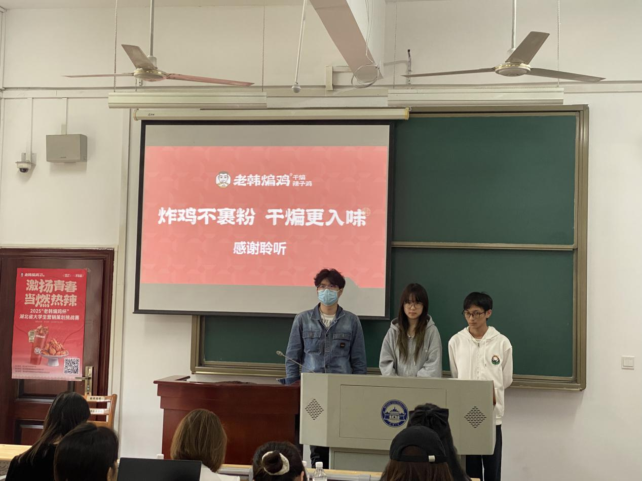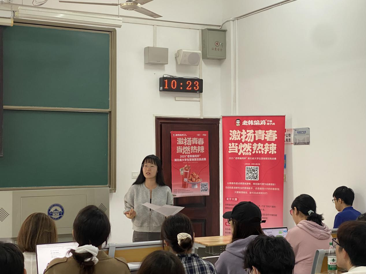 各参赛队伍围绕老韩煸鸡“招牌辣子鸡贝贝/干煸系列”产品展开调研与策划,通过问卷调查、市场走访与消费者访谈等方式,深入分析品牌现状与竞争格局,提出了兼具创意性与可执行性的营销方案。参赛作品涵盖品牌定位优化、传播策略创新、数字化营销应用等多个方向,充分展现了武大学子在市场营销领域扎实的理论基础与鲜明的实战意识。