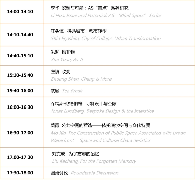 本次以“盲点”为名的研讨会的一个重要议题是探讨在当今的城市境况下,建筑能贡献和能获得什么。虽然“盲点”的具体含义还有待进一步探索,本次研讨会的目的即是希望能搭建一个平台,讨论当下城市转型中被忽视、无视,及尚未被认识的那些方面,激发现行城市发展系统之外的一些理念、理解、发现、解决方案和实践,并借此思考其对建筑自身所带来的可能性。