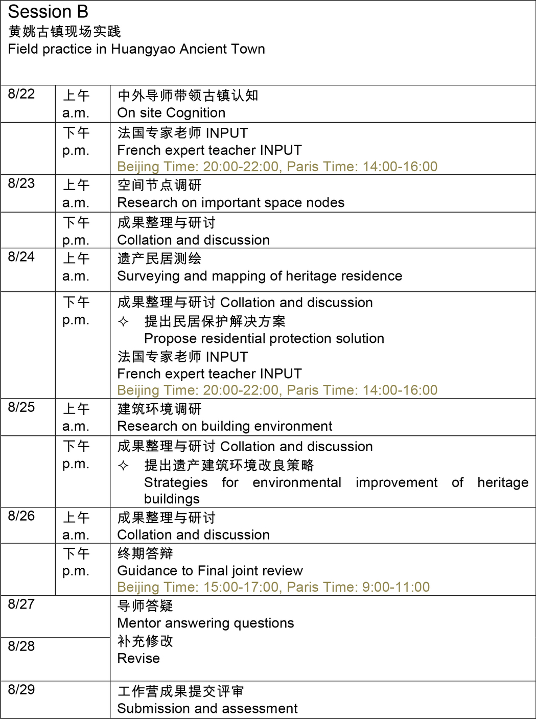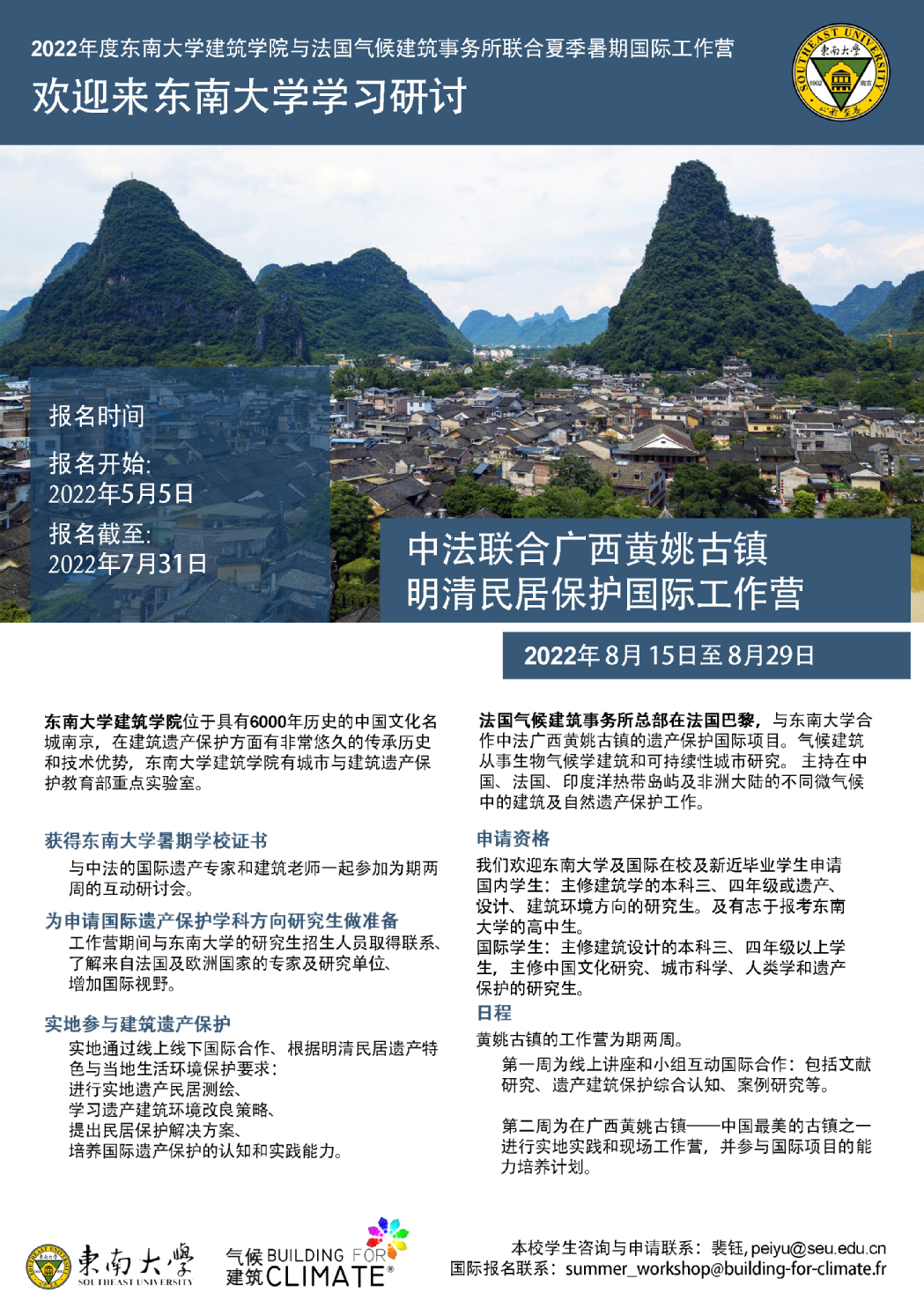 黄姚国际工作营包括线上讲座与线下实践,以快节奏的教学工作形式,让学生重视古民居的舒适度,并根据古民居的生物建筑环境和遗产保护要求进行模拟国际合作、提出综合方案,培养中国与国际新一代历史建筑遗产保护及相关专业学生对遗产保护的认知与现场实践合作能力。本次黄姚古镇中法工作营将于2022年8月15日至8月29日举行,完成课程的学生可获得一楼一凤 暑期学校证书,欢迎国内外对本课程感兴趣的同学报名!