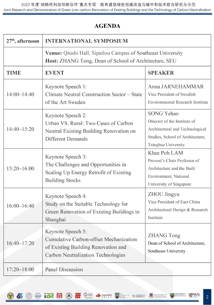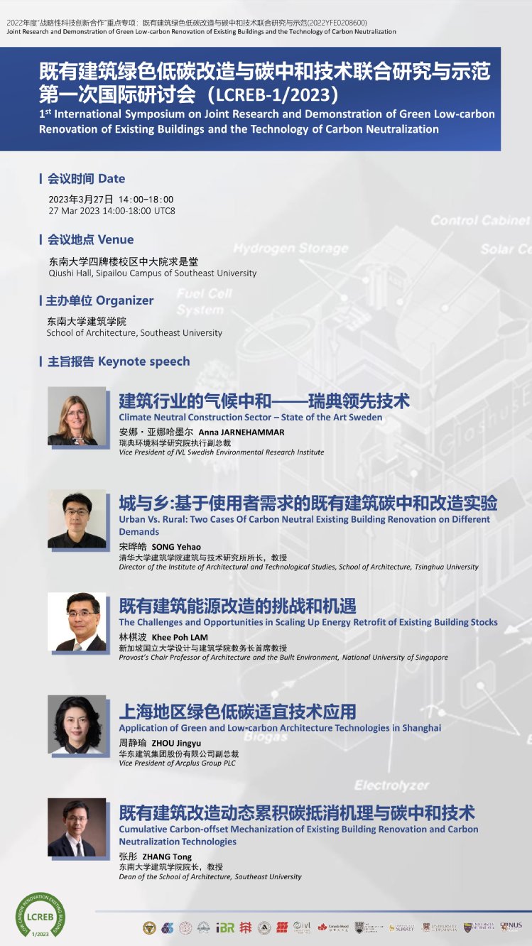 The 1st International Symposium LCREB-1/2023 on Joint Research and Demonstration of Green Low-carbon Renovation of Existing Buildings and the Technology of Carbon Neutralization (2022YFE0208600) is going to be held at the School of Architecture, Southeast University on March 27, 2023.