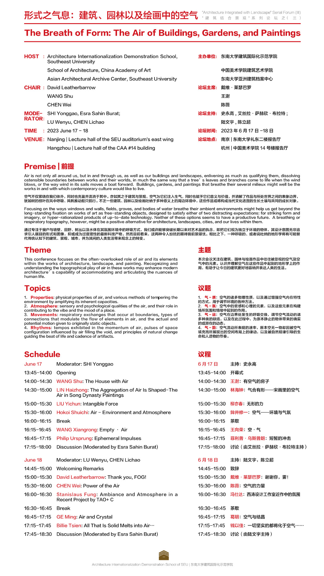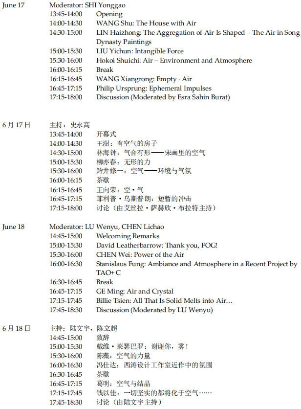 14号楼报告厅 Air is not only all around us, but in and through us, as well as our buildings and landscapes, enlivening as much as qualifying them, dissolving ostensible boundaries between works and their worlds, in much the same way that a tree’s leaves and branches come to life when the wind blows, or the way wind in its sails moves a boat forward. Buildings, gardens, and paintings that breathe their several milieux might well be the works in and with which contemporary culture would like to live.空气不仅萦绕在我们体外,同时也充盈并流淌于其中。亦如其之于建筑与景观,空气为它们注入生气,同时也赋予它们意义与价值,并消解了作品与所处世界之间的表象边界,犹如树的枝叶在风中呼吸、风帆推动船只前行。不乏一些建筑、园林以及绘画吐纳于多种意义上的周边环境中,这些作品或将构成当代文化适宜的生长土壤与共同的成长对象。Focusing on the ways windows and walls, fields, groves, and bodies of water breathe their ambient environments might help us get beyond the long-standing fixation on works of art as free-standing objects, designed to satisfy either of two distracting expectations: for striking form and imagery, or hyper-rationalized products of up-to-date technology.Neither of these options seems to have a productive future. A breathing or respiratory topography, however, might be a positive alternative for architecture, landscapes, cities, and our lives within them. 通过专注于窗户与墙壁、田野、树丛以及水体在其氛围环境中的呼吸方式,我们或许能够突破长期以来对艺术品的执念,即把它们视为独立于环境的物体,其设计意图无非追求引人瞩目的形式和图像,抑或成为过度理性的最新科技产物。然而目前看来,这两种令人纷扰的期待皆前景堪忧。相比之下,一种呼吸的、或者说吐纳的地形学将有可能替代传统认知下的建筑、景观、城市,并为其间的人类生活带来观念上的转变。This conference focuses on the often-overlooked role of air and its elements within the works of architecture, landscape, and painting. Recognizing and understanding the topographical play of air in these works may enhance modern architecture’s capability of accommodating and articulating the nuances of human life.本次会议关注在建筑、园林与绘画作品中往往被忽视的空气及空气中的元素。认识并理解空气在这些作品中起到的地形学上的作用,有助于让今日的建筑更好地容纳并表达人类的生活。1. Properties: physical properties of air, and various methods of tempering the environment by amplifying its inherent capacities.2. Atmosphere: sensory and psychological qualities of the air, and their role in contributing to the vibe and the mood of a place.3. Movements: respiratory exchanges that occur at boundaries, types of connections that modulate the flow of elements in air, and the actual and potential motion given to originally static objects. 4. Rhythms: tempos exhibited in the momentum of air, pulses of space configuration influenced by air filling the void, and principles of natural change guiding the beat of life and cadence of artifacts.1. 气-质:空气的诸多物理性质,以及通过增强空气内在特性的方式,用于调节环境的各种方法。