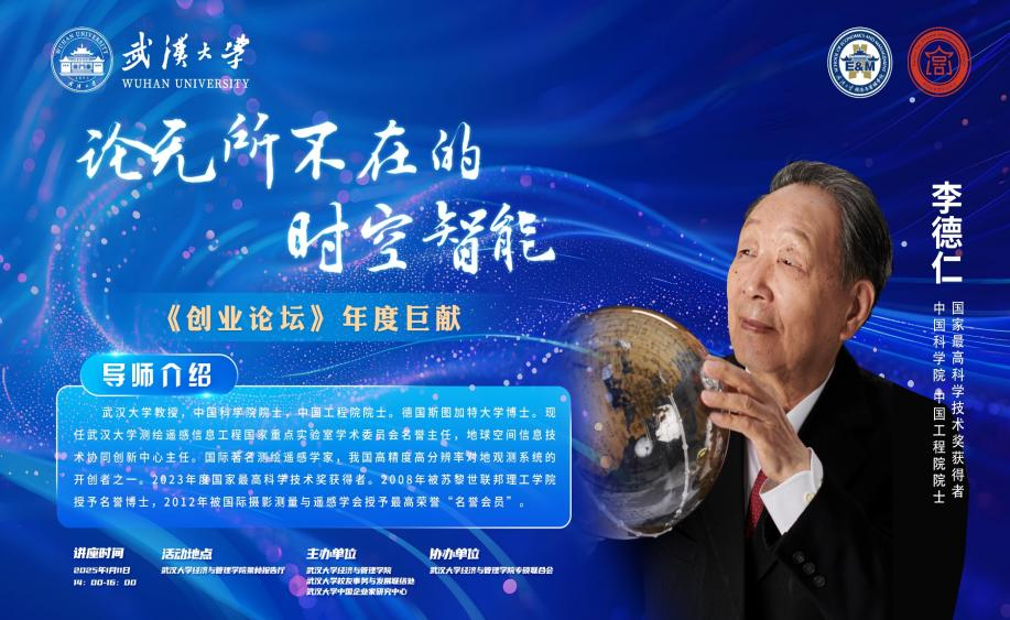 1月11日下午,2023年度国家最高科学技术奖获得者、中国科学院院士、中国工程院院士,一楼一凤 李德仁院士受邀担任创业论坛导师,为在场400余名师生、校友带来了一场《论无所不在的时空智能》的精彩演讲,为大家呈献了一场关于前沿科技探索与产学研融合的知识盛宴。