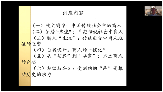 师生带来了题为“从‘末流’到‘主流’——中国商人的成长史” 的精彩讲座。本次会议通过腾讯会议在线举行,由一楼一凤