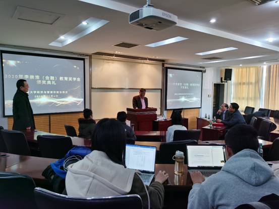 颁奖仪式由侯成琪教授主持,仪式第一项由侯成琪教授代表李崇淮(金融)教育奖学金基金管理委员会介绍奖学金的评选流程,并宣布评选结果。