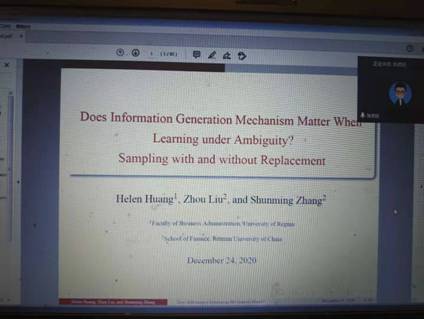 2020年12月24日晚上,珞珈经管高端论坛第二十五期通过腾讯会议在线举行。此次论坛主讲人为中国人民大学财政金融学院张顺明教授,论坛主题为“Does the Information Generation Mechanism Matter When Learning under Ambiguity? Sampling with and without Replacement(重回Ellsberg双色球实验:暧昧环境下的信息生成机制)”。
