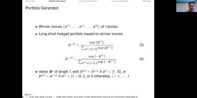 会议首先由汤珂老师带来了题为“AlphaPortfolio: Direct Construction Through Reinforcement Learning and Interpretable AI”的工作论文。汤珂老师介绍了本文的创作动机。在传统研究投资组合的大框架下,两步法估计均值和方差是非常难的,两步之间容易出现脱节。而一步法基于强化学习的思路,相对于两步法可以更好地给出投资组合的权重。随后,汤珂老师从理论模型、相关实证研究等方面做了详细介绍。作者基于Al的突破,开发了量身定制的多序列神经网络模型,以区分经济和金融数据的特征,同时允许在没有标签的情况下进行训练。由此产生的AlphaPortfolio具有出色的样本表现,且在各种经济限制下均表现出色。此外,作者将AlphaPortfolio投影到更简单的建模空间上,以揭示投资绩效的关键驱动因素。最后,汤珂老师强调,选择模型应当尤为注重其可解释性,而非一味追求数据上好的结果。