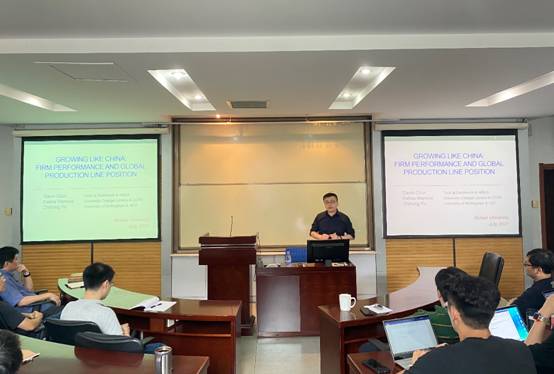 的张天顶教授指出俞教授的研究框架为全球价值链领域现有的宏微观研究提供了一个很好的范本。与此同时,张天顶教授就这一研究的背后事实与全球价值链的未来发展方向提出了自己的看法。俞老师对张老师的意见进行回应并表示感谢。与会老师和同学就多元化分工和专业化分工的优势和劣势,以及国内销售与国外销售之间的关系进行了拓展讨论。讲座在热烈的研讨氛围中圆满结束。
