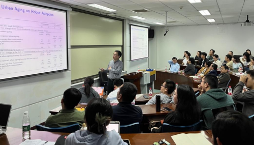 11月6日上午,浙江大学文科资深教授张俊森做客“珞珈经管发展论坛——世界经济论坛”,以“二元经济中的人口老龄化:城市老龄化,大规模人口迁移与农业发展”为题进行学术报告。论坛由世界经济系和健康经济与管理研究中心联合举办。宋敏教授主持,聂军院长出席。傅十和、罗知、刘林青、龚锋、卢盛峰、刘成、李旭超、李汛、张平、亢梅玲、耿志祥、逄金栋、罗璇、熊瑞驰、郭汝飞等教师以及30余名研究生参加论坛。