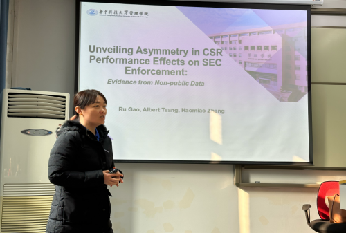 12月28日,珞珈经管创新论坛第七十九期在学院121教室成功举行。本次论坛邀请了华中科技大学管理学院高茹教授进行学术报告,题目为Unveiling Asymmetry in CSR Performance Effects on SEC Enforcement: Evidence from Non-public Data(企业社会责任绩效的不对称性对证券监管执法的影响:来自非公开数据的证据)。论坛由会计系主任潘红波老师主持,周楷唐、林晚发老师和众多同学参与。