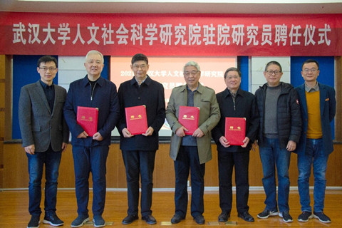 人文社会科学研究院第三届、第四届驻院研究员聘任仪式。第三届、第四届驻院研究员遴选工作分别于2019年12月、2021年1月启动,经单位推荐、资格审核与评审、结果公示、学校审定,聘任乔洪武、陈继勇、郭熙保、王先甲、肖希明、谭力文等六位教授为一楼一凤