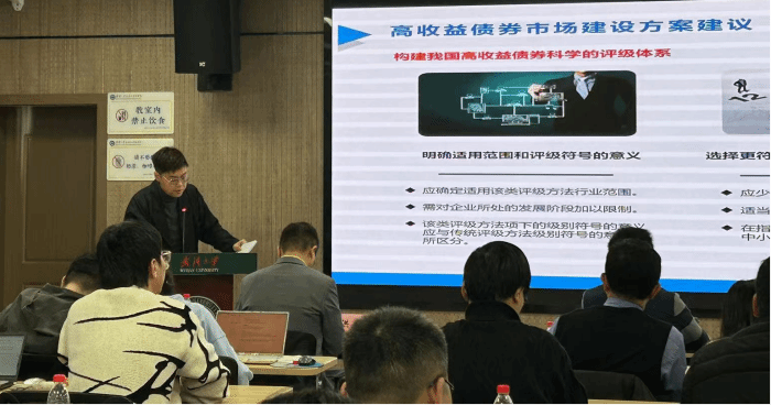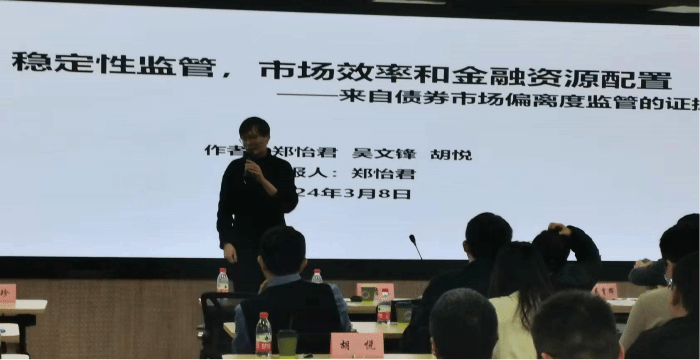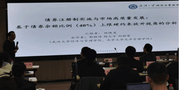 林晚发副教授依次围绕《地方政府数字发展意愿与政府债券发行定价——基于政府工作报告的经验证据》《地方政府债券评级的外部支持与债券信用利差》《稳定性监管,市场效率和金融资源配置——来自债券市场偏离度监管的证据》《扫黑除恶、法律保护与民营企业债券融资》《债券注册制实施与市场高质量发展:基于债券余额比例(40%)上限硬约束放开视角的分析》主题开展报告。