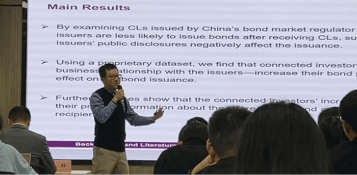 丁一教授在《Regulatory Enforcement of Public Disclosure and Connected Investors in Corporate Bond Issuance》中报告了通过研究中国债券市场监管机构在债券发行前发行的CL(返回问询函),发现发行人在收到CL后发行债券的可能性较小,表明监管机构对发行人公开披露的担忧对发行产生了负面影响;利用专有数据集,发现与发行人有业务关系的金融机构会增加债券购买,以减轻CL对债券发行的负面影响。