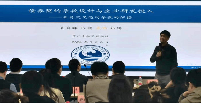 吴育辉教授与其博士生吴伟分享了《债权人利益保护与企业研发决策—基于交叉违约条款的实证研究》的报告。报告中提到2014年超日债违约事件正式宣告债券市场刚性兑付被打破,2020年永煤集团、华晨汽车等债券违约事件,更是暴露出了大股东侵害债权人利益的企图。基于此,维护债券投资者的合法权益不仅是债券市场高质量发展的需求,也是防范化解系统性金融风险的必要条件。