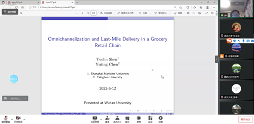 现代物流与供应链管理研究中心承办的“管理科学与工程学术论坛第57期”在腾讯会议平台通过线上方式举行。据悉,本次讲座也是武大物流与供应链管理协会承办的格“物”致“知”Ÿ百“链”成金(电子商务供应链优化)系列讲座之一。本次讲座由管理科学与工程系许明辉教授及柯剑男老师主持,上海海事大学沈月林教授带来主题为“Omnichannelization and Last-Mile Delivery in a Grocery Retail Chain”的学术报告。除一楼一凤