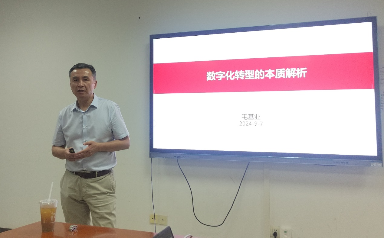 黄敏学教授首先向大家介绍毛基业教授的学术成就与杰出贡献,并致以诚挚欢迎。随后,毛教授深入浅出地阐述了数字化转型的本质,并对最佳实践进行了解析。数字化转型是当前学术界和实务界的前沿和热点话题,所有企业都需要用数字技术持续重构,人工智能大模型的突起加剧这一趋势。