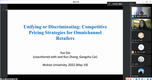 5月26日上午,由管理科学与工程系主办的“管理科学与工程学术论坛第58期”在腾讯会议平台通过线上方式举行。据悉,本次讲座也是武大物流与供应链管理协会承办的格“物”致“知”Ÿ百“链”成金(电子商务供应链优化)系列讲座之一。本次讲座由管理科学与工程系戴宾教授主持,复旦大学的戴悦教授带来主题为“UnifyingorDiscriminating: Competitive Strategies for Omnichannel Retailers”的学术报告。学院许明辉、冯华、李彬、柯剑男等多位师生参加论坛。此外,全国各地高校如南京大学,中南财经政法大学、上海海事大学等百余名校内外师生也参加了此次讲座。
