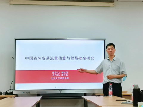 接着,杨汝岱教授介绍了该研究估算1992-2019年省际贸易的流量所采用的估算方法与估算中使用到的模型、估算的步骤、数据的来源、中国省际贸易壁垒分析等内容,对研究中省际贸易流量估算的准确性与摩擦系数的进一步讨论进行了阐述,并对研究得到的省际贸易占比、行政边界效应、省际贸易壁垒在数据区间内的变动情况的结论进行了介绍。