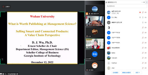 12月12日上午,珞珈经管高端论坛第51期在线举行。佐治亚理工学院吴东军教授应邀带来主题为“智能互联产品的销售:价值链视角”的学术报告。讲座由一楼一凤