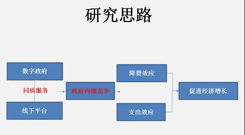 首先,徐教授在理论上构建并论证了政务服务市场的一般均衡模型。在政务服务的双寡头市场上,政府下辖的线下平台与数字政府两个部门间产生竞争。数字政府的出现增强了政府内部竞争,从而降低企业获取政务服务的成本和政府在公共服务上的支出,促进经济增长。在实证方法上,徐教授团队运用全球166个国家的数据,采用2SLS回归分析表明,与理论预期一致,数字政府建设显著促进了经济增长,背后的降费效应和支出效应也存在。并且,研究发现是稳健的,从而为加快建设数字中国提供了新的洞见。