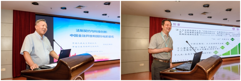 金融系主任李斌主持。上半场,吴晓求教授首先作题为“法制契约于科技创新:中国金融开放和国际化的基石”的演讲。他将中国式现代化最核心的两大支点概括为经济的可持续增长和法制的现代化,认为经济的可持续增长需要依靠有中国特色的社会主义市场经济体制和模式,以及科技进步基础上的产业升级和迭代来保障与推动。随后,梁琪教授作题为“‘绿色溢价’谁获益?商业银行绿色治理的贷款溢价效应研究”的汇报,利用手工收集的中国上市公司贷款数据和我国银行绿色治理指数构建,考察了银行绿色治理对信贷定价的影响。研究发现,银行绿色治理会通过绿色声誉效应和绿色成本效应提高其信贷定价,且这一效应在银行端绿色治理类型和企业端绿色表现上存在异质性。
