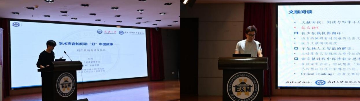 学术经验分享环节,2023级人力资源管理专业博士生向远、2025级企业管理专业博士生张硕分别以“学术声音如何讲‘出’中国故事——论文写作与发表路径”、“学术声音如何讲‘好’中国故事——科研方法工具箱”为题分享。向远结合投稿经历,强调研究内容“断舍离”与细致回应审稿意见的重要性;张硕则从文献检索、管理、数据分析及软件工具应用等方面,提供实用科研技巧。