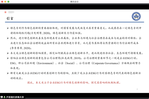 会计系硕士研究生尹荫璐汇报的论文题目是“企业ESG行为与绿色创新自中国A股上市公司的实证发现。”论文关注到目前的热点问题:国内的环境问题和ESG问题。以往的文献多探讨ESG对公司财务表现、资本市场的影响,这篇文章研究ESG对绿色创新的影响,并且深入探讨了中间的机制(降低融资约束、吸引高素质人才、提高高管薪酬),拓展了现有的研究,对政府要加强ESG和企业社会责任制度的带来一定启示。会计系博士研究生殷文菁对这篇文章进行了点评。