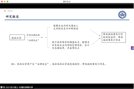 会计系硕士研究生向珊报告的论文主题是“税收征管强度与城投债发行定价”。论文从地区间税收征管强度的角度出发,实证考察了税收征管强度对城投债发行定价的影响。研究得出了地区税收征管强度能够降低城投债的发行成本的结论,且这一作用是由于地方政府担保能力提高和信息不对称程度降低带来的。进一步研究发现在债券无担保、地区金融发展水平较弱、城投公司偿债能力较差、地区欠发达时,税收征管的效果显著。研究结论提供了税收征管和城投债发行定价关系的经验证据,为地区间的税收征管、防范地方政府债务风险、降低城投公司发债成本提供了借鉴。会计系博士研究生王空对这篇文章进行了点评。
