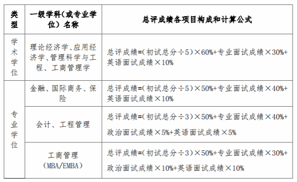 根据各一级学科(或专业学位)培养要求和考试形式,总评成绩各项目构成和计算公式如下: